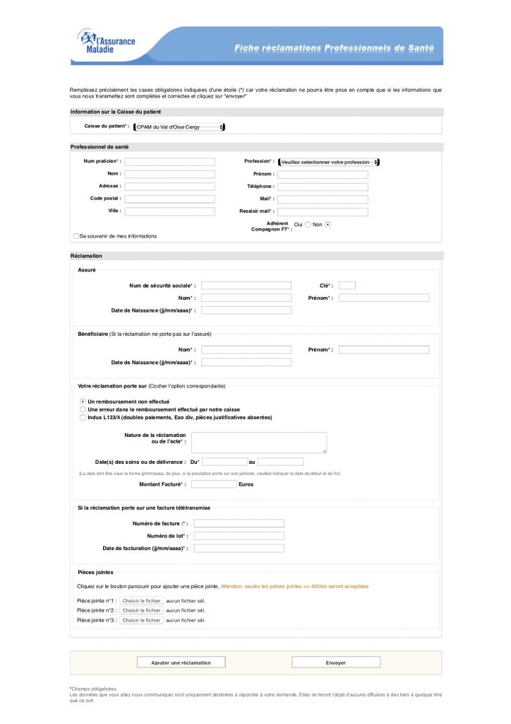 Vous retrouverez le lien vers l’outil et d’autres informations utiles sous www.ameli.fr, pour les médecins, dans la rubrique Actualités : «Val d’Oise : Faites votre réclamation en ligne!» (Flyer, article newsletter médecin de juin).