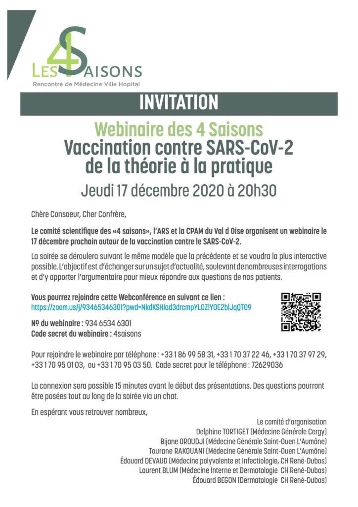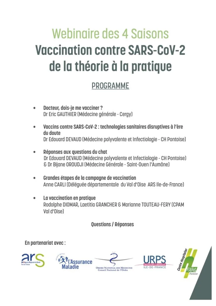 Le comité scientifique des « 4 saisons », l’ARS et la CPAM du Val d’Oise organisent un webinaire le 17 décembre prochain autour de la vaccination contre le SARS-CoV-2.