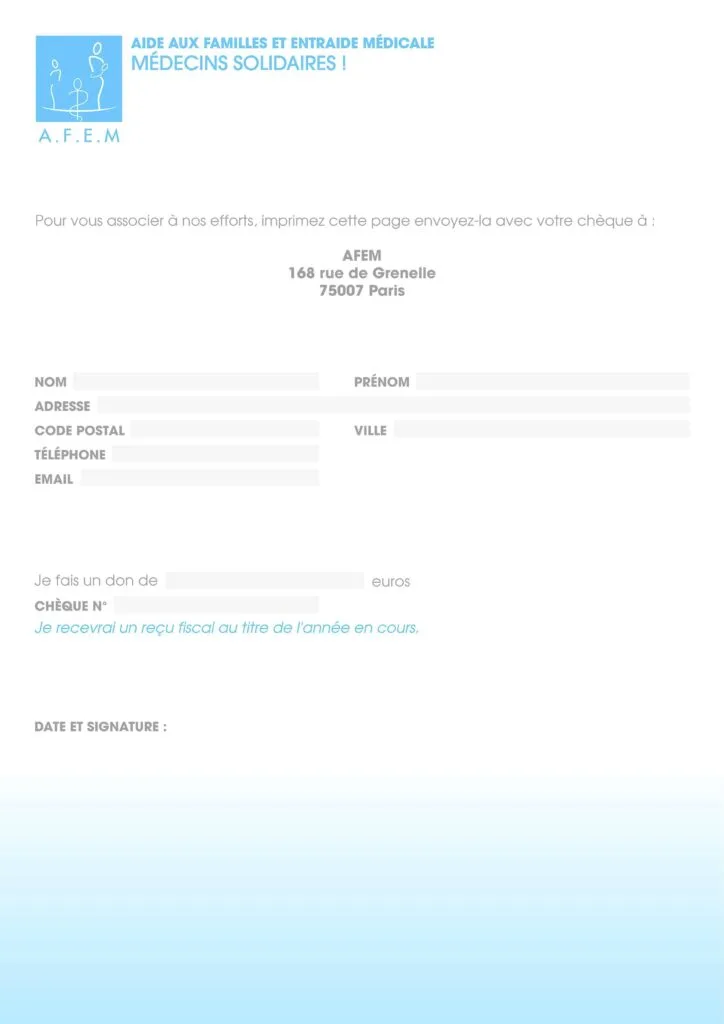 Comme vous le savez, L’ AFEM (Aide aux Familles et Entraide Médicale) vient en aide aux familles dont le parent médecin ne peut plus exercer en raison de situations dramatiques (décès ou incapacité). Les enfants de ces familles en sont les principales victimes. Grâce à vos dons, l’ AFEM soutient cette année encore environ 300 familles en grande difficulté. Pour faire face à des demandes de plus en plus pressantes, nous souhaiterions que vous renouveliez en 2021 le dongénéreux que vous avez fait antérieurement.