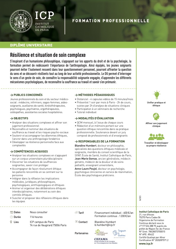 S’inspirant d’un humanisme philosophique, s’appuyant sur les apports du droit et de la psychologie, la formation permet de redécouvrir l’importance de l’anthropologie. Ainsi équipés, les jeunes soignants pourront éviter l’isolement ressenti dans leur questionnement personnel, pourront affronter la question du sens et se découvrir résilients tout au long de leur activité professionnelle. Le DU permet d’interroger le sens d’un geste de soin, de connaître la responsabilité soignante engagée, d’apprendre les différents mécanismes psychologiques, de reconnaître la souffrance au travail et savoir s’en prémunir.